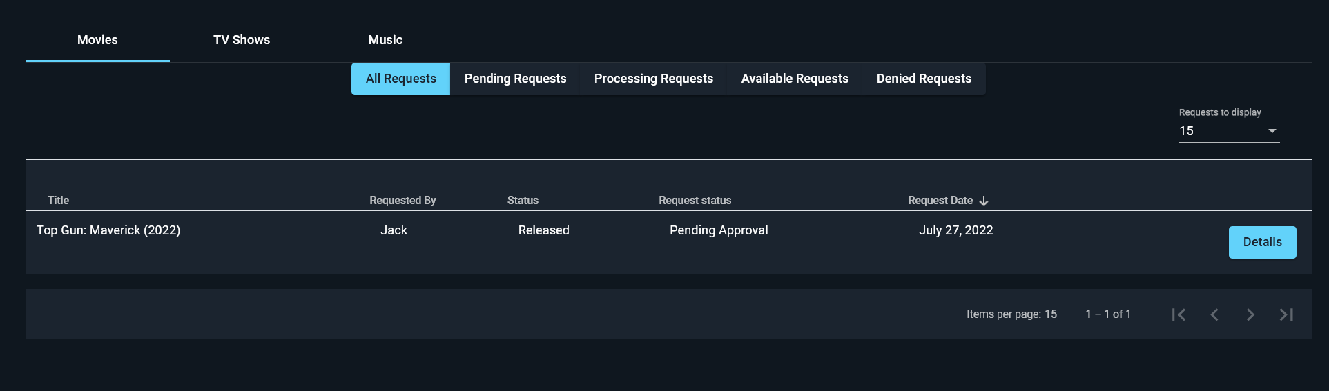 After the request has been submitted, you can check the status of your request by clicking "Requests" on the left edge of the screen. This will show you your pending, approved, denied, and available requests. When you request, it will be marked as "pending" and will send me an email letting me know about the request. After that, if the request is approved, it will be moved to "processing" while it downloads and you will receive an email letting you know it was approved. When the item has finished downloading and is on Plex, it will be labeled "available."