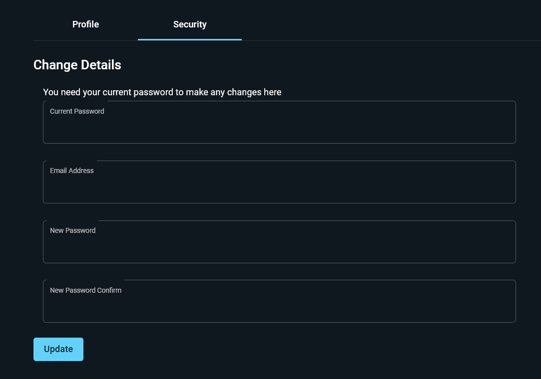 On your profile screen, select the "security" tab and enter your previous password and your new password, then click "update."